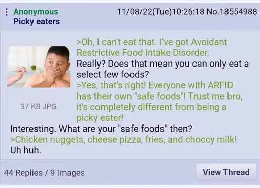 I don’t have AFRID, but I know people who do. Your delusional if you think it’s a choice and they can just decide to eat other things without wanting to throw up