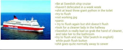 With a thick Swedish accent, she whispered into his ear: “The bathroom in my cabin has very good plumbing”.
