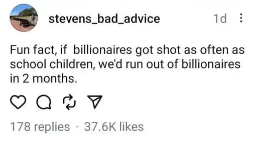 ID: stevens_bad_advice posted: “Fun fact, if billionaires got shot as often as school children, we’d run out of billionaires in 2 months.”