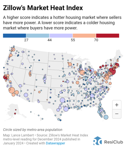 Red indicates areas that have large numbers of interested buyers per unit, low supply levels, low time on market, some combination of that, which indicates that sellers have the ability to set the price in negotiations.