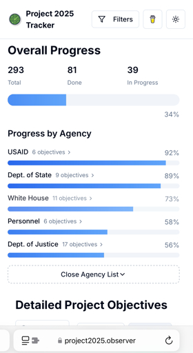 This tool live tracks the progress of the various campaigns promises that were part of the Heritage Foundation’s Project 2025 manifesto, which supported Trump during his last campaign.