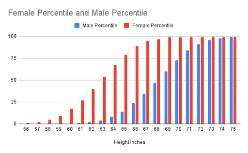 This shows the height distribution between males and females. Example almost 100% of people under 5 ft are female