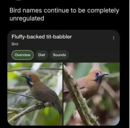 minus-squareremotedev@lemmy.calinkfedilinkEnglisharrow-up13·11 months ago“I discovered a new bird, and you will not believe what this fluffy little guy did to me!”