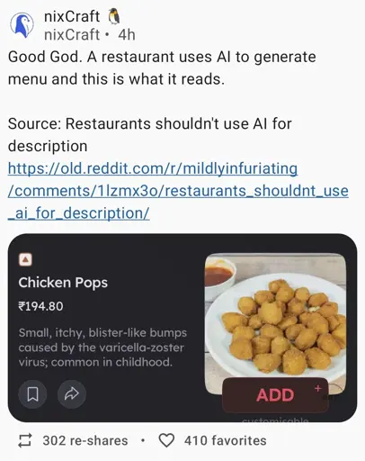 I’m saying they could tell generalities to the AI, like “this is a dish we serve at a restaurant”, or give the description in an other language if it’s available. Not to give a full english description of the item. The only reason I can see for such an output would be a mistranslation coming from the title alone with no context whatsoever.