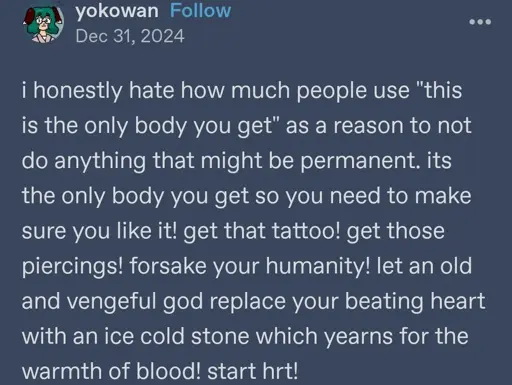 minus-squarertxn@lemmy.worldlinkfedilinkEnglisharrow-up6·3 months agoPeople who use “your body is a temple” as an argument against tattoos or body modifications have never seen a fucking temple in their lives.