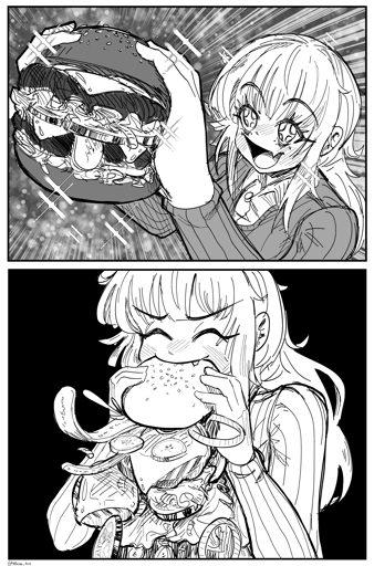 First panel reminds me of all the burger commercials. The side facing her must just look like 2 buns cus all the stuff’s over here.