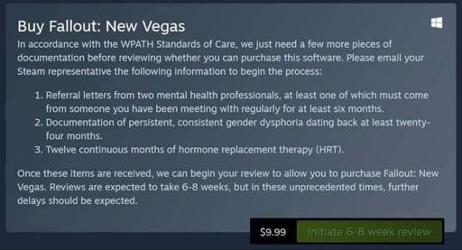 Many trans people play fallout new Vegas to the point it’s a vommon joke. The joke here is that you must go through all the hoops of bottom surgery before playing the game as if it’s a similar action to recieving bottom surgery