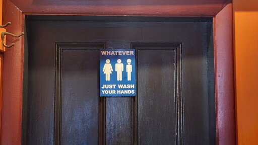 Any trans person can correct me, but it just feels kind of “all lives matter.” In Seattle, I’ve seen a lot of signs with very authoritative and explicit language explaining that the bathroom is for everyone. Not as whimsical, but more clear.