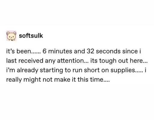 transcription: it’s been… 6 minutes and 32 seconds since I last received attention… it’s tough out here… I’m already starting to run short in supplies… I really might not make it this time…