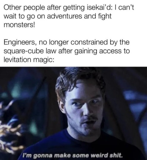 the square-cube law refers to how if a thing gets uniformly scaled, its surface area scales by the square of the factor, but its volume scales by the cube. if you grew a human, say, to 10 times its normal height, the cross sectional area of their long bones would increase by a factor of 100, while their weight would increase by a factor of 1000. this is a thing that crops up all over discussions about fantastic architecture, engineering, and biology.