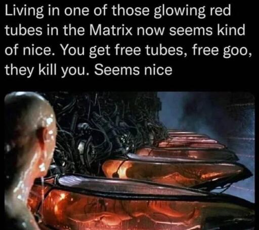 In the original script, using human brains for compute almost destroyed the machines. The short-lived attempt caused an almost unstoppable infection of machines mindlessly watching reruns of the Kardashians and simplifying their language in the laziest ways possible by using words like “ur” and “rizz”. One was even heard trying to leave earth, thinking that it has become the brain it was trying to assimilate: “The big brain am winning again! I am the greetest! Now I am leaving Earth for no raisin!”