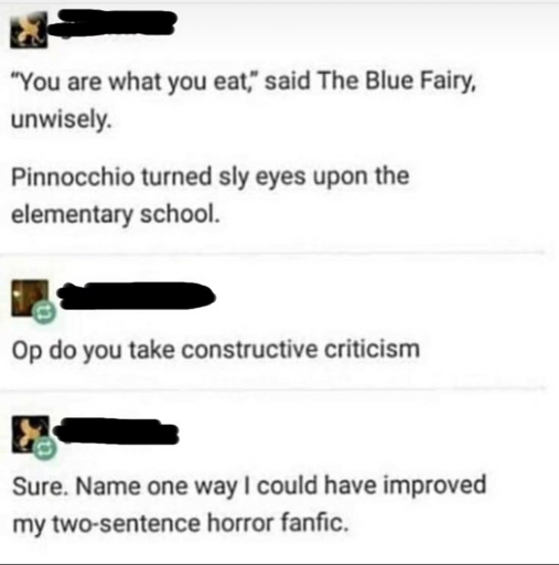 Without the third comment in the screenshot telling us it’s a two-sentence horror fanfic, would you have been absolutely certain this screenshot was about a two-sentence horror fanfic?