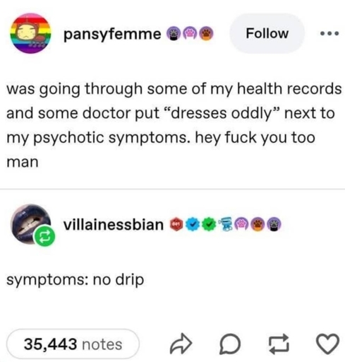 I once had a psychiatrist write that I was wearing “gender neutral clothing” in the sentence after stating I was “currently undergoing gender re-assignment from male to female”. I was wearing a pretty feminine sweater, skinny jeans and doc martens. It was hard not to see it as a dig at the fact I wasn’t wearing a dress or skirt, which is something that’s absolutely used to gatekeep trans women from transition related healthcare.
