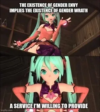 transcription: the existence of gender envy implies the existence of gender wrath, a service im willing to provide