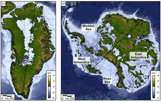 Had no idea Antarctica had this little land. A lot of flow paths for melt to the ocean. Greenland on the other hand, can have much of its galcier melt into inland lake.