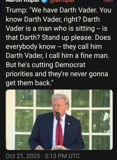 I don’t think Trump is the Emperor, because he was smart. Or Darth Vader, because he was effective. I think Trump is like… the Death Star if it didn’t work properly and instead of firing lasers it randomly blasted other planets with shit.