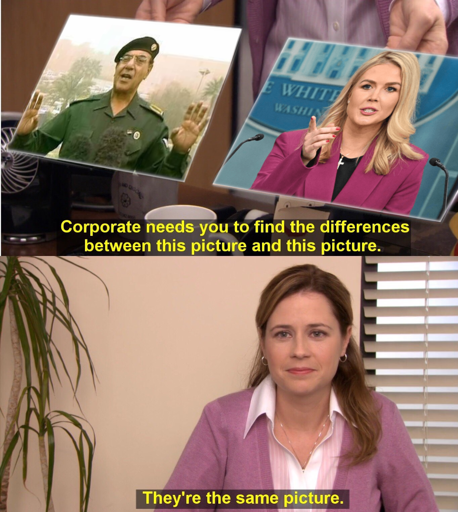 On the left we have Baghdad Bob the Iraqi “Minister of Information” for Saddam Hussein, who made famously inaccurate and at times comical propaganda about the Iraq war. On the right is Karoline Leavitt the US “press secretary” for Donald Trump, who famously makes inaccurate and at times comical propaganda about the fall of the United States.