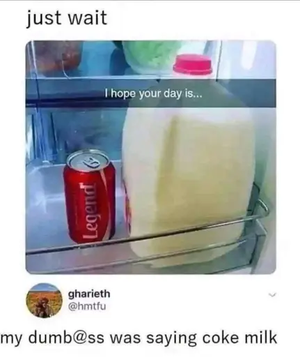 My dumbass is over here “Legend milk??? Coke milk??? I don’t get it! 😖”