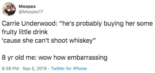 I never got why she cared what that other woman drank. That woman isn’t her enemy. What if she’s just having cranberry juice because she’s a recovering alcoholic? What if she loves shooting whiskey but is having the fruity drink so that she doesn’t go destroying other people’s property again? Leave that woman out of it, you don’t know her life and she doesn’t know you exist. Have your whiskey and take it out on that cheating fuck.
