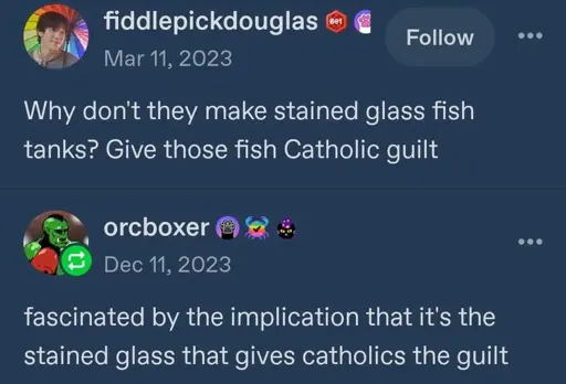 minus-squareCrashumbc@lemmy.worldlinkfedilinkEnglisharrow-up1·2 months agoOr that Catholics actually have guilt…