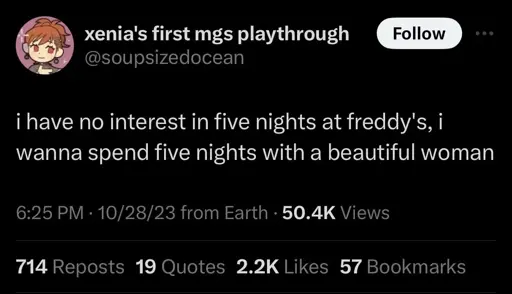 Omega@piefed.blahaj.zone to 196@lemmy.blahaj.zoneEnglish · 3 months agofive nights rulepiefed.cdn.blahaj.zoneimagemessage-square17linkfedilinkarrow-up1291arrow-down15