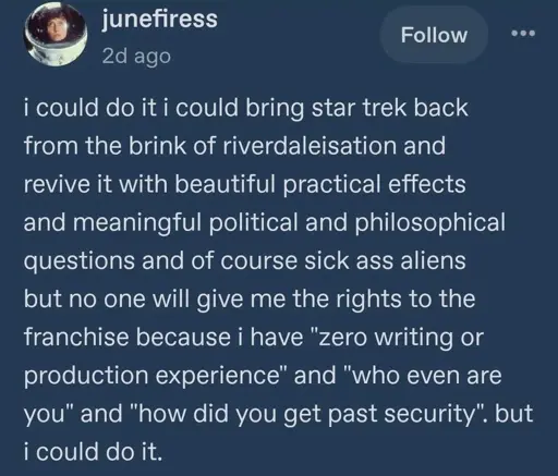 Everyone who cares about it could. Too bad the people who care about it are not the ones producing it besides maybe the actors. But if I was fucken Spock on that show I’d be complaining about that already. As a successor to Leonard, its practically your job if you want to do him and the role right.