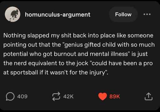 Gifted kid is still smart much like not pro sport guy is still good their sport. But both have the reality of they weren’t good enough when they grew up with their respective skills being their only identity.