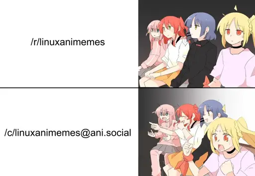 It took us a while, but we’re finally here on the Lemmyverse! You may have seen us on /r/linuxanimemes on Reddit. We’re still going to keep the subreddit open for those who prefer Reddit, but for the rest of us, this community on ani.social is our second home.