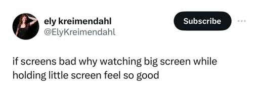 I mean it doesn’t feel so good, it feels like im missing out on big screen, or watching something which doesn’t matter on big screen, and also doing something on little screen which doesn’t matter. It feels like I’m ruining my life whenever I check a message on my phone whilst epic show I want to watch exists.