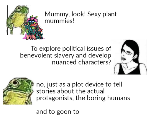 I have more fun having sex with a person than a doll. Well, except for dollgirls, but that’s another conversation. People are political creatures. Take the politics out of a person, and a doll is what you get. How can a plant be hot if she isn’t a nuanced individual? If a plant is turning me into a pet, she better exist as an individual (or a hivemind, I’ll admit) situated within a cultural context, with an internal world and life experiences. Otherwise what’s the point? You might as well tie yourself up for all the masturbatory character of the act!
