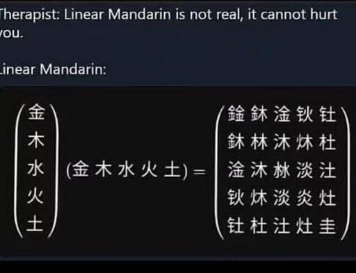 Second, as far as I can tell this really is a Chinese linear algebra joke. The left side is just the five elements of Chinese philosophy (Metal, wood, water, fire, soil), and the right side seems like it might be people’s names? They’re unintelligible enough to me that I assume they’re names. But the names are constructed of hanzi that use the same radicals (Brush strokes) as the five elements, combined with each other according the the 2D matrix. I wish I knew what the names were but, I’m a beginner student.