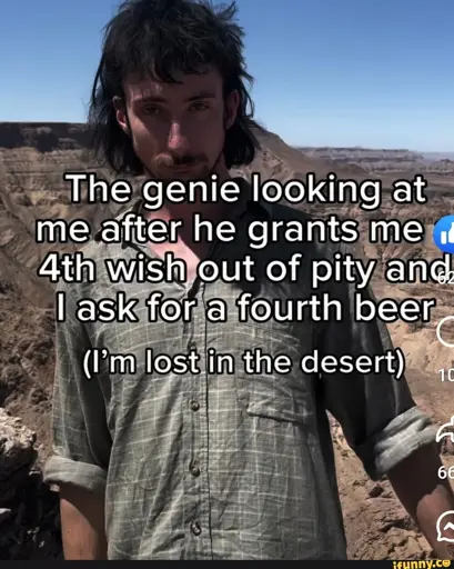 transcription: the genie looking at me aftre he grants me 4th wish out of pity and i ask for a fourth beer (im lost in the desert)