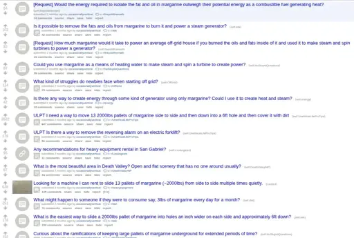 u/occasionallyvertical, what happened to you and your margarine? Did you go off grid, powering your house with it? Did you eat it?