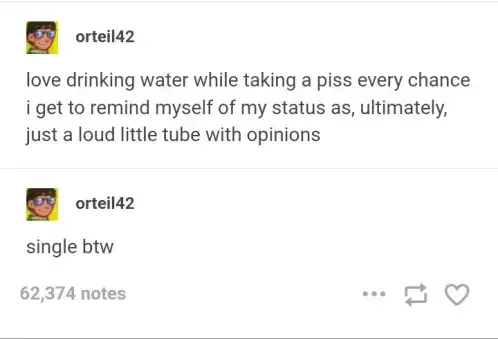 Taking this opportunity to again remind people that the urinary tract is not directly connected to the digestive tract, so this is not an example of a person being a tube. Now, if you have a snack while taking a poo, that would be an example of being a tube, if more hygienically questionable.