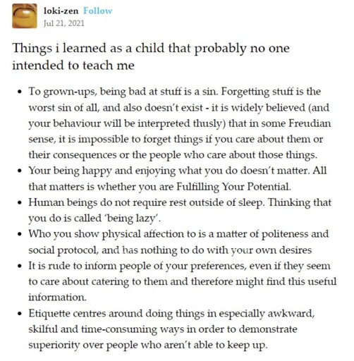 I mean these things weren’t taught through anything as explicit or obvious as physical abuse (except spanking I guess… hmm). No one would know how painful my childhood was if I didn’t tell them, and even if I did a large proportion of people wouldn’t see any problem at all. Mostly it was constant negative feedback for perceived shortcomings or disobedience, and the complete lack of positive reinforcement or affection. Their authoritarianism and the impossibility of their punishments changing my fundamental nature meant punishment eventually extended to denying me anything they could think of. Anyone on the outside would probably say my parents were doing their best with a “difficult” child. That their actions came from a place of “love”. But really it was two neurodivergent people passing their trauma and abuse onto me. It was subtle, slow, and insidious emotional damage, accumulated over years.