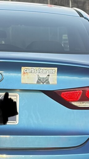 Assuming the cat is a decoartive addition - what would curbs have to fear from cars? Isn’t it the other way round? If not, what would curbs have to fear from cats?