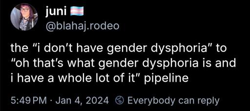 That’s literally me right now. I cannot imagine what someone must feel for them to transition and how they might feel because of the transition (though can obv appreciate and accept that some have those feelings I can’t directly relate to).