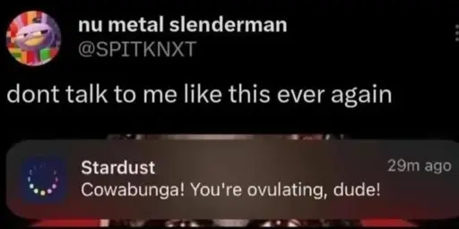 A tweet reading “don’t talk to me like this ever again” above a screenshot of a notification saying “Cowabunga! You’re ovulating, dude!”