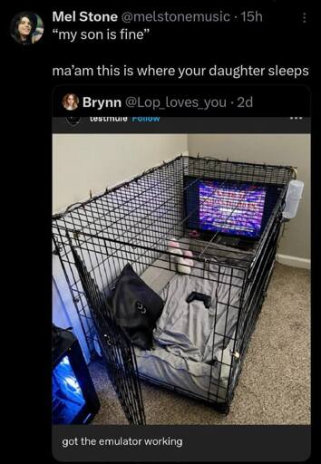 the op has a female pfp and is bragging about the emulator working. i think its meant to be read that op is trans and likes to sleep in a cage, and the parents are in denial