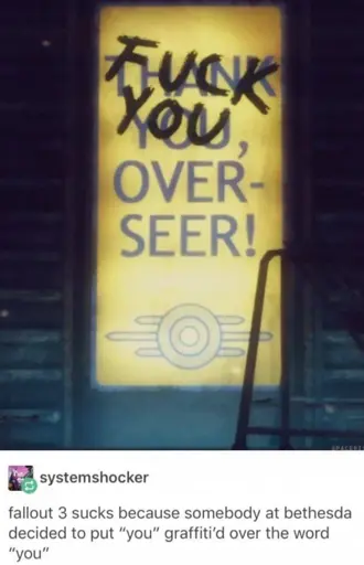minus-squareceenote@lemmy.worldlinkfedilinkEnglisharrow-up40·12 days ago Yes. It’s a shame Fallout 3 has that one and only problem.