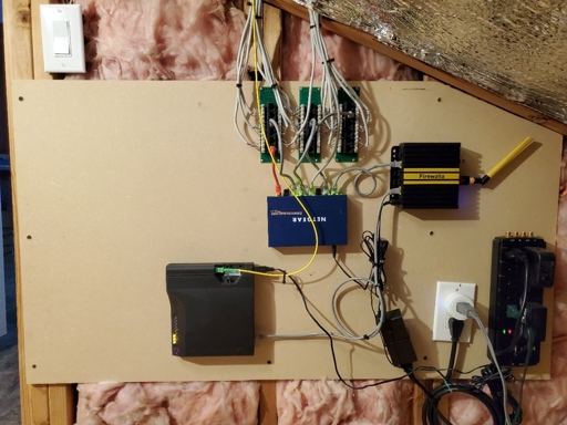 Maybe not the prettiest, but a little cleaner than it was when it began. If I had it to do over, I might use a small 9.5" rack if such a thing existed. Originally I had the Netgear and patch cables in a Square-D circuit breaker box but it seemed unnecessary and a bit cramped with no air flow. I then added the Firewalla and moved the fiber over with all the other gear. I have room to expand but I don’t think there is anything else I will ever need to add to this location. I have another networking rack more centrally located in the house. There was also tons of coax here but I coiled it up and tucked it away in case it is ever needed again. I originally wired my house with 2 network drops and 2 coax drops to each wall outlet. This spot services 6 drops to my office, two lines to my main networking rack, and the main internet connection.
