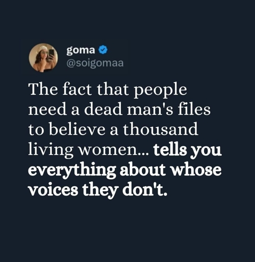 I am genuinely very confused by this post. Were there really a lot of people who saw the Epstein files and were like, “Oh, so maybe women were telling the truth after all”? Because all of the reactions I have seen so far are either “I knew it!” or possibly “Whoa, this goes even further than I thought!”