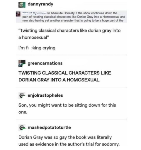 Wait, Dorian Gray is gay? Shouldn’t he be bisexual as he is infatuated with a girl in the beginning?