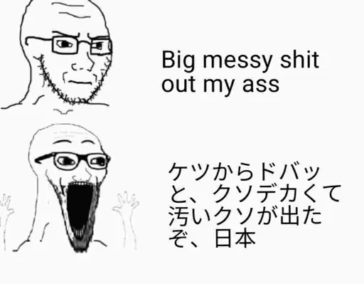 The part in Japanese can be roughly translated to: shit bursting out of my ass, the big and stinky shit came out, japanese.