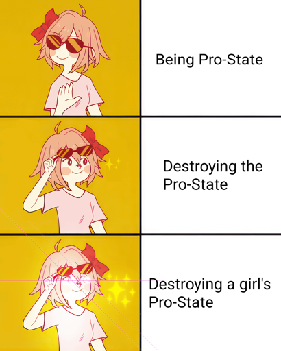 Alt text: 3 panel Coolyori/fem “drake” meme format Top: dismissive pose, text “Being Pro-State.” Middle: lifting sunglasses, sparkles, text “Destroying the Pro-State.” Bottom: dramatic glow and lens flare, text “Destroying a girl’s Pro-State.”