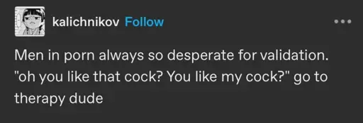 I’m just saying that I find the trope/kink disgusting, its a massive turn off for me, for the reason I described.
